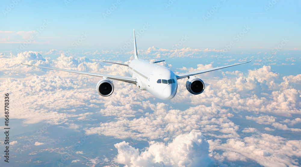 White passenger airplane flying in the sky amazing clouds in the background - Travel by air transport