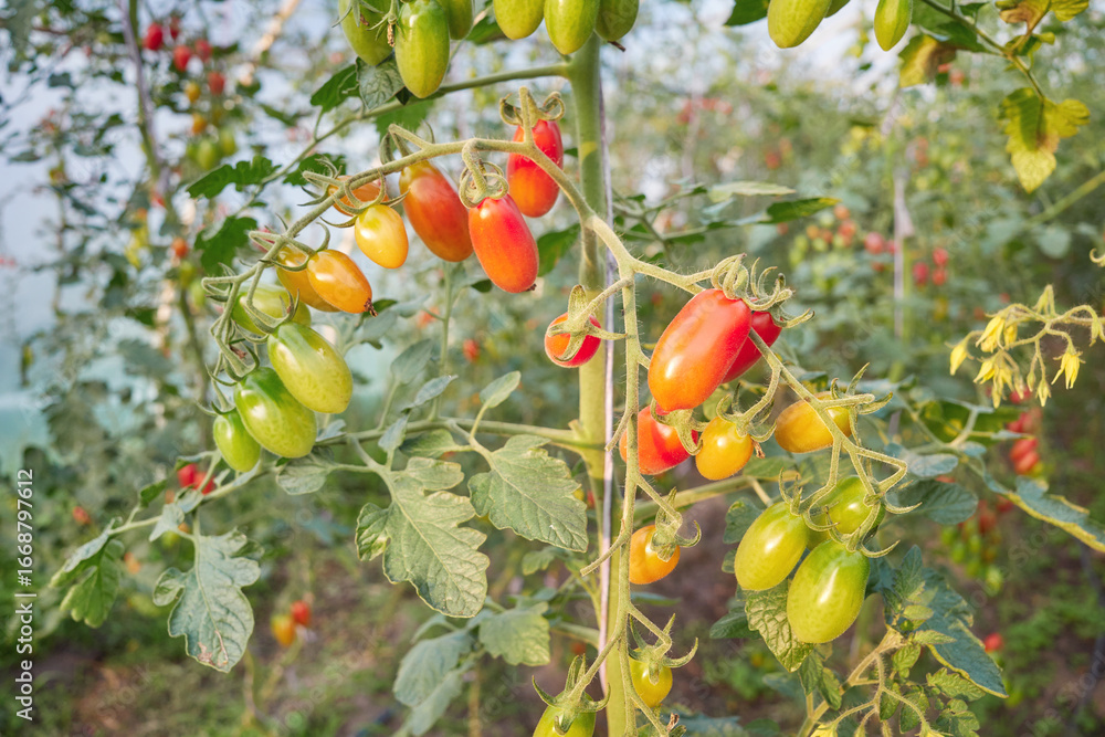 Organic tomatoes grown in a greenhouse, selective focus.