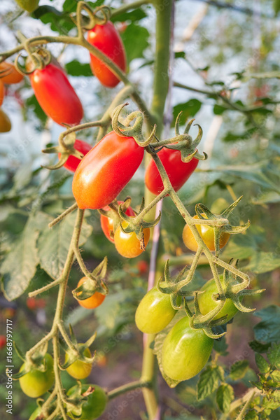 Organic tomatoes grown in a greenhouse, selective focus.