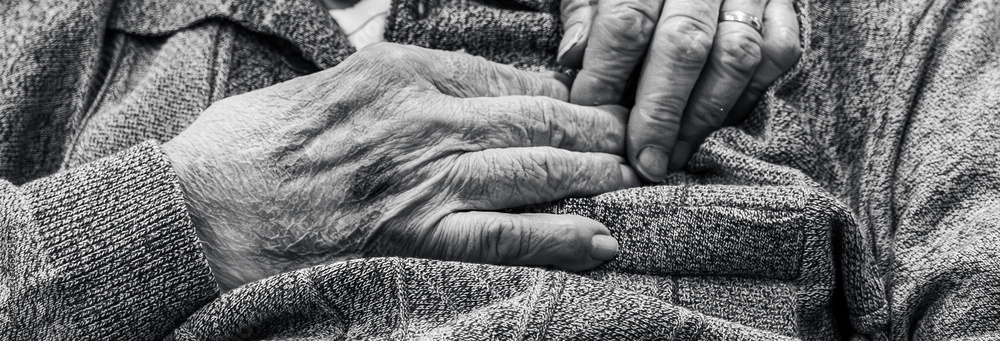Elderly hands joined in a tender gesture, wedding ring visible, black and white fine art photograph. Universal portrait of love, resilience, and the passage of time in Beaune, Burgundy, France
