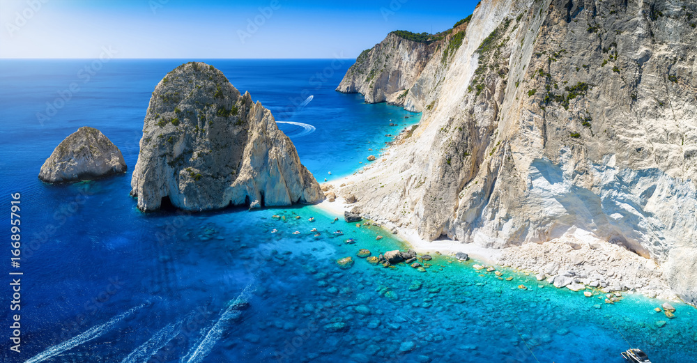 The beautiful beaches of Mizithres at the west coast of Zakynthos island, Greece, with crystal clear sea during summer time