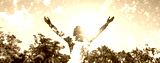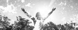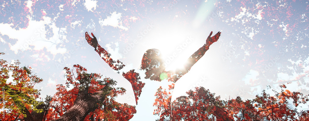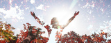 Young girl spreading hands with joy and inspiration facing the sun and nature