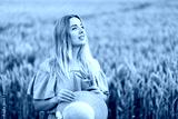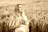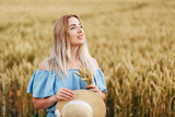 Portrait of woman in blue dress and straw hat against a background of wheat field