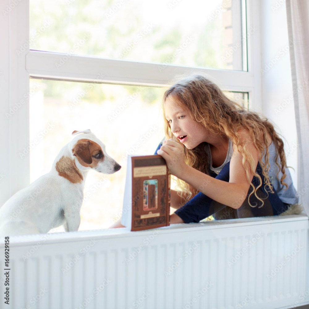 Girl reading book at home with dog
