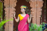 Young indian woman wearing pink saree and colorful turban standing outdoor. Culture of india. Rajasthan people