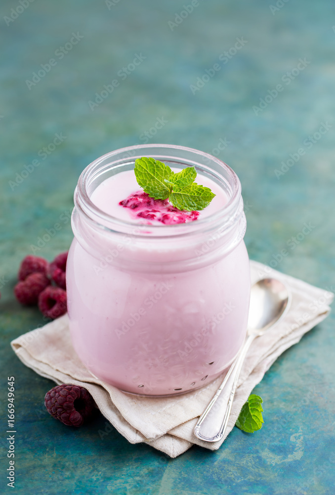 Natural homemade yogurt with raspberry and mint, selective focus, copy space