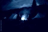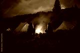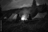 Two friends share stories and warmth around a glowing campfire at dusk, surrounded by tents in a serene wilderness camp.