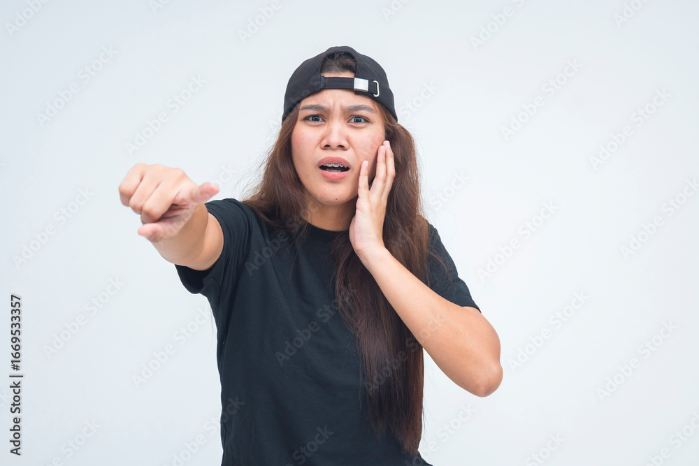 Surprised young boyish woman holding her cheek with one hand while pointing forward with a shocked, wide-eyed expression. Isolated on a white background.