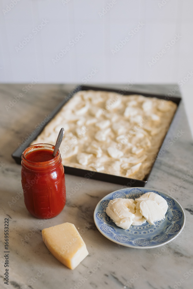 Cheese Topping on Unbaked Pizza Dough in Baking Pan