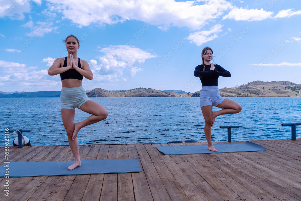 Women practicing yoga on a wooden dock by the lake during a sunny day
