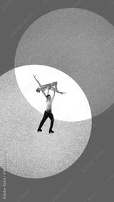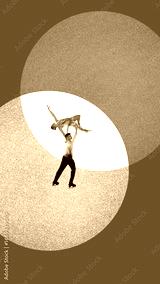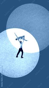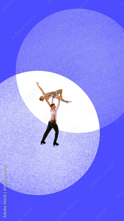 Digital collage art. Pair figure skaters performing dramatic overhead lift on icy stage. Concept of elegance, trust, strength, performance, competition, winter lifestyle, and art.