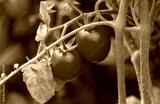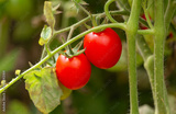 Beautiful red ripe heirloom tomatoes grown in a greenhouse. Gardening tomato photograph with copy space. Shallow depth of field