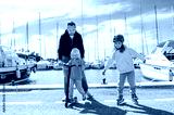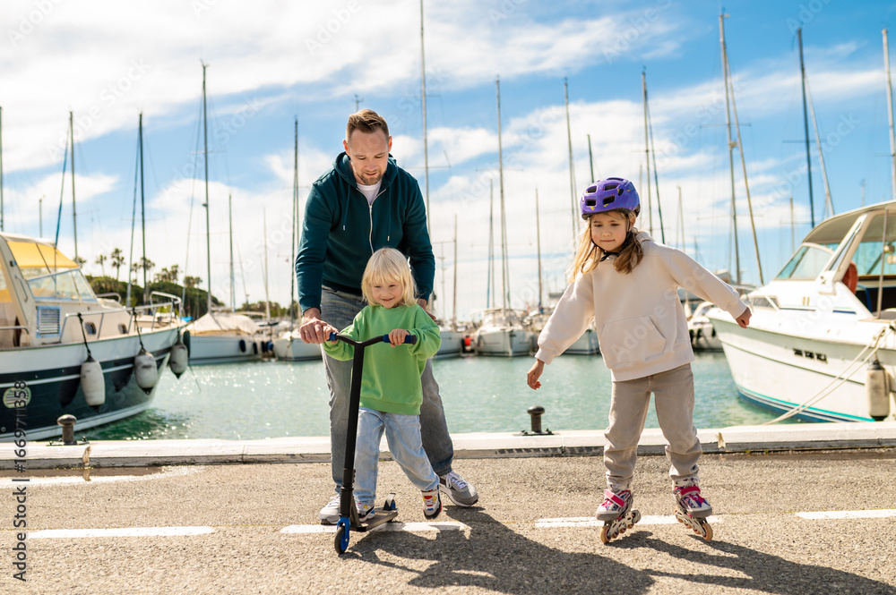 Smiling man supporting cheerful blond boy on scooter along waterfront pier with skating daughter