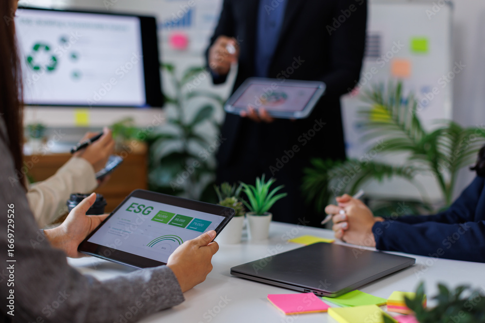 Team of asian business ESG Presentation and Team Collaboration. A professional woman presents ESG metrics to colleagues in a modern meeting room.