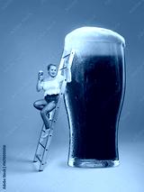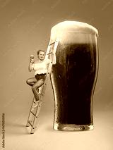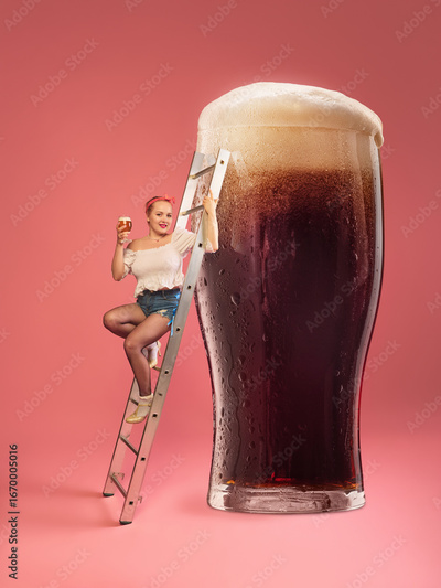 Woman on ladder holding beer mug next to giant dark beer glass with foam on pink background. Concept of surreal humor, beverage lifestyle, creative advertising, refreshment, and playful promotion.