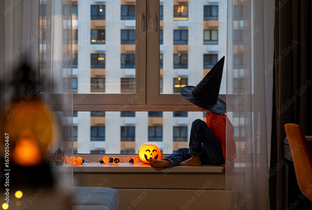 Little girl sits by window in witchs hat and halloween pumpkin lantern in autumn evening. Child at window of big city waits for holiday. Halloween