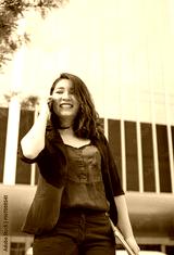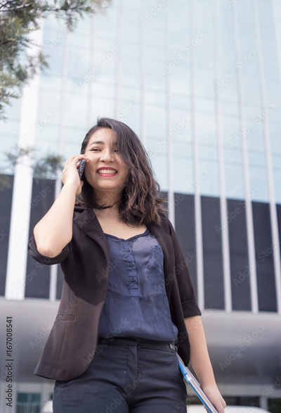 confidence smart asian business lady hold her laptop and talking front of high building in urban location action smile
