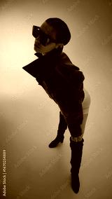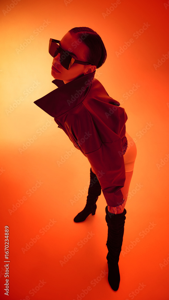 Woman in futuristic leather jacket posing with oversized sunglasses on vibrant orange background. Concept of fashion, individuality, bold emotion, digital art, and modern culture.