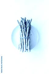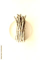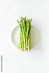 Asparagus. Banch of fresh steams on plate on white background top-down copy space