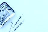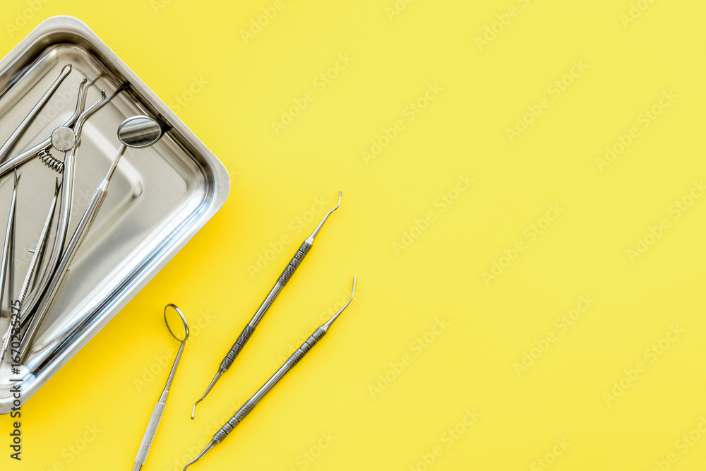 Dentak care concept. Stomatological tools in tray on yellow background top-down space for text