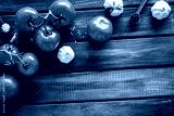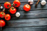 Tomatoes harvest. Vegetables near garlic, greenery and spices on wooden background top-down frame copy space