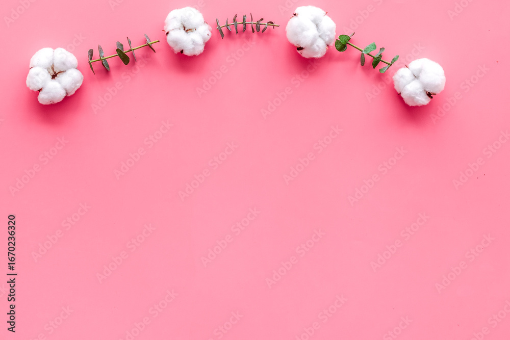Flowers border with eucalyptus branches and dry cotton on pink background top view space for text. Blog mockup