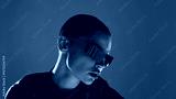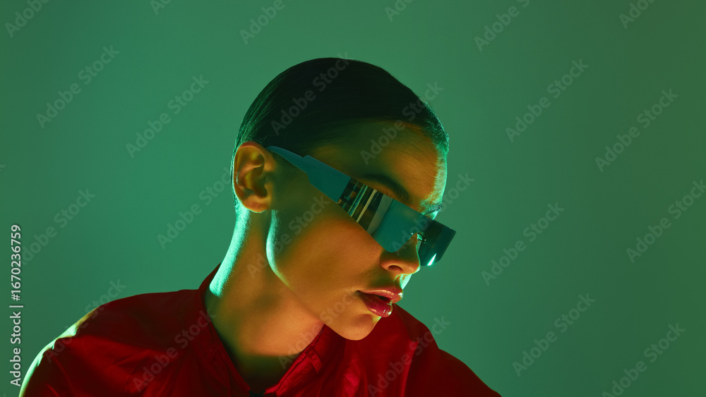 Close up portrait of woman in red outfit wearing futuristic mirrored glasses with green neon glow. Concept of style, modern identity, fashion, digital art, and bold individuality.