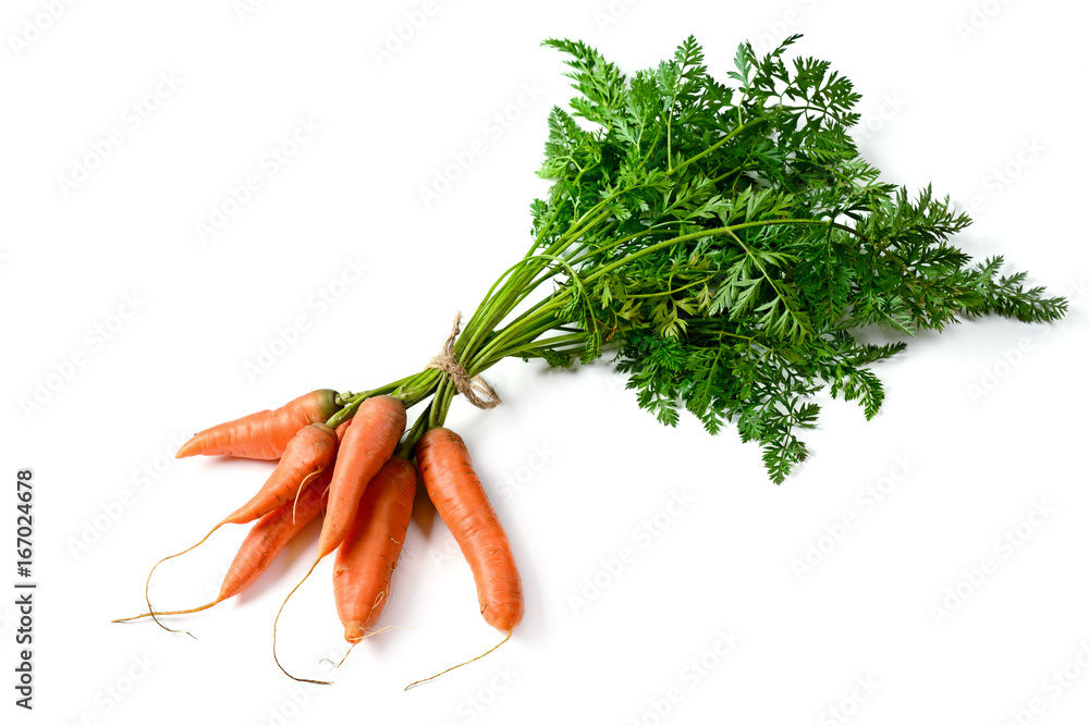Bunch fresh carrots isolated on white. Vegetables from garden.