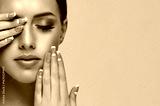 Beautiful model girl with a beige French manicure nail design with rhinestones . Fashion makeup and care for hands and nails and cosmetics