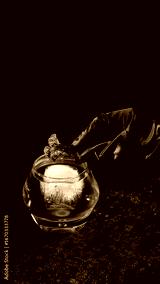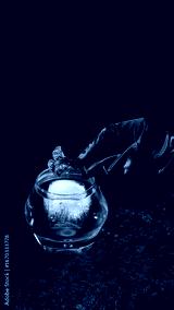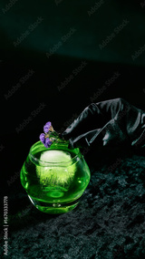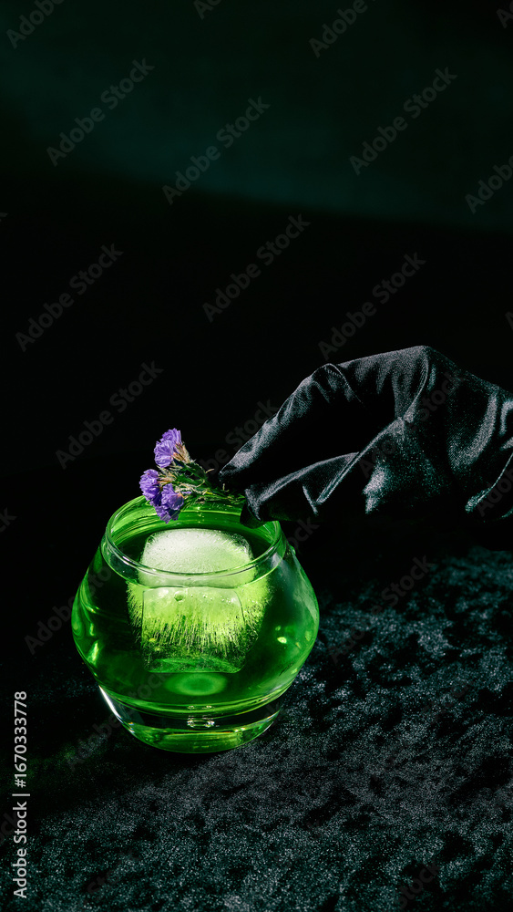 Green cocktail with ice cube and flower garnish in round glass. Concept of bar advertising, premium alcohol campaigns, menu design, and creative cocktail visuals.