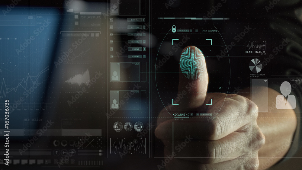cyber security internet and networking concept.Businessman scanning fingerprint biometric identity for approval with VR interface diagram.