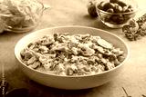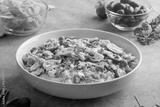 Homemade macaroni salad with bow tie pasta and canned tuna, carrot, onion, corn, tomato, green peas and mayonnaise dressing in a white plate on wooden table.