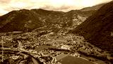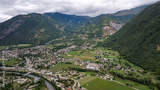Aerial view of Sainte Marie de Cuines in the Maurienne valley, Savoie department, Auvergne Rhone Alpes region, France, showcasing the town nestled amidst mountains and lush greenery