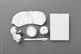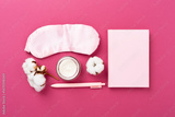 Sleeping mask with accessories on color background, top view. Sleeping routine concept