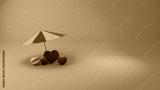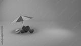 Umbrella over three cube hearts with a beach ball on teal background with space on the right side for text