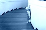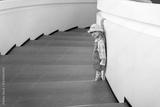 Little child girl portrait in futuristic interior and curves of white stairs