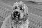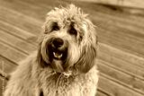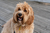 Portrait of a curly-haired brown Labradoodle or goldendoodle dog on the waterfront in summer