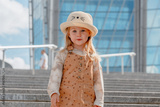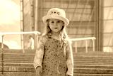 Cute little child girl in dress and hat on the background of a blue glass high-rise building in Saint Petersburg