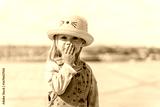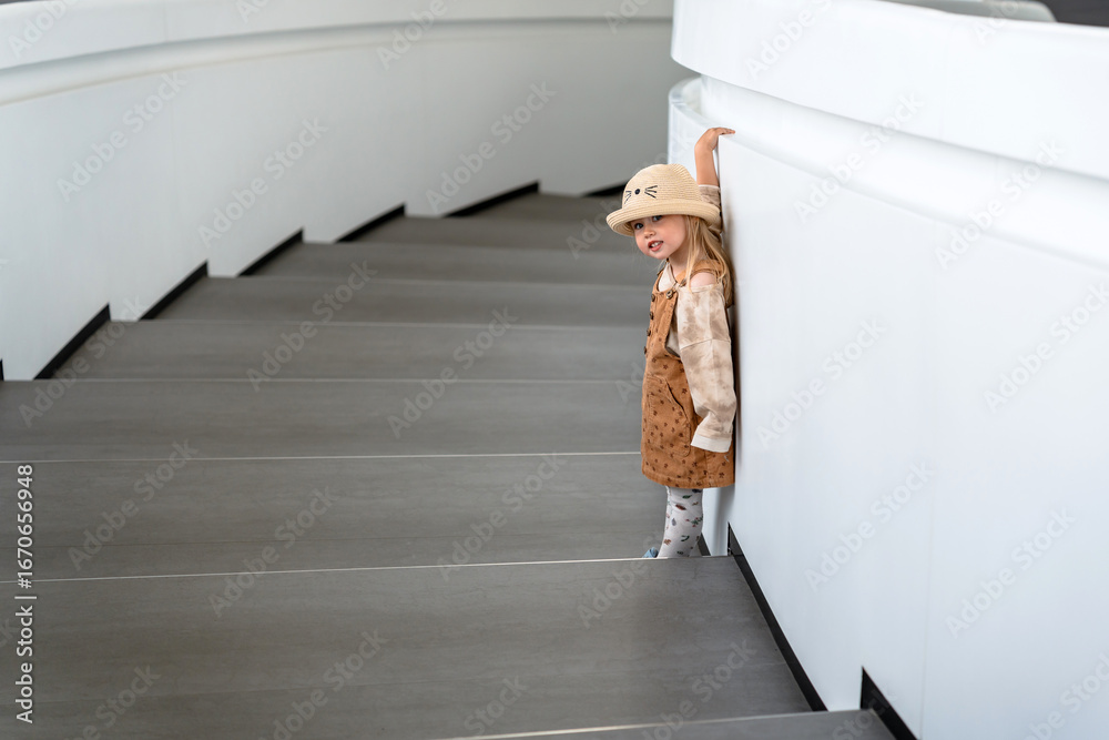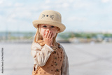 Portrait of Little child girl Caucasian covers her mouth with her hand