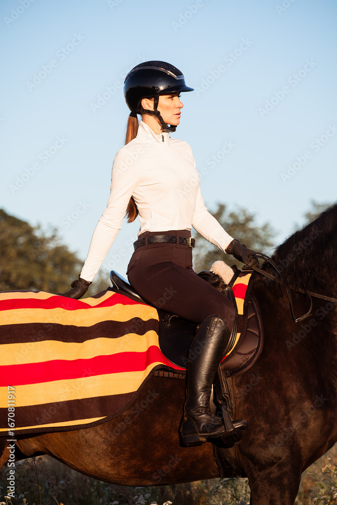 Fashion rider photo, woman on horse, side view