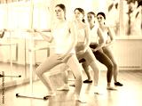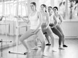 Sporty motivated young girl participating in group barre session in fitness studio, performing demi plie exercise to improve flexibility and strengthen muscles..