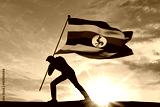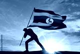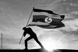 Uganda flag being pushed into the ground by a male silhouette. 3D Rendering