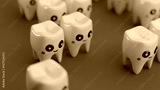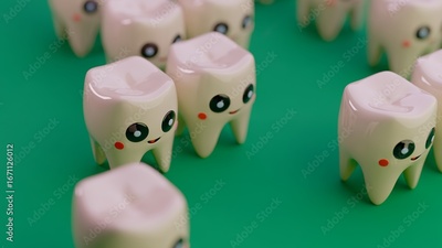 Tooth characters with eyes and mouths grouped in the foreground on green background with additional teeth behind and copy space on the right side