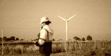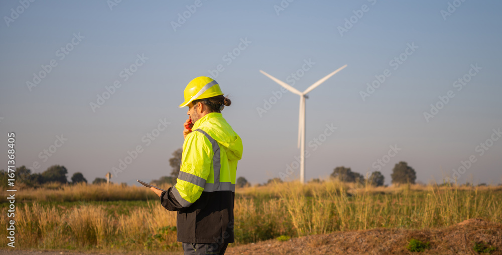 Engineer working in front of wind turbines for checking wind turbines of the field during beautiful sunset. Alternative energy concept.