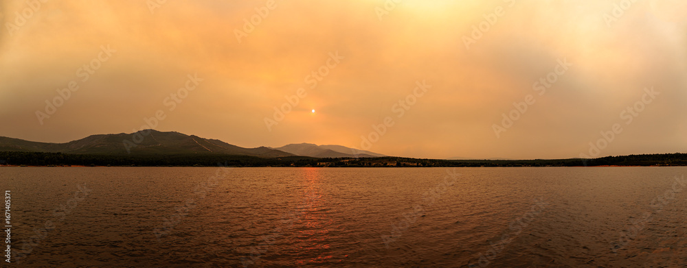 Panoramic view of the Valtabuyo Reservoir and Monte Teleno with smoke from several forest fires in 2025, Tabuyo del Monte, León, Spain.