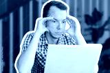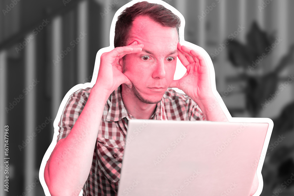 Stressed Man Holding Head Looking At Laptop With Red Color Overlay Remote Work Concept