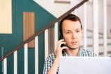 Man With Mobile Phone And Laptop Serious Expression While Working At Home Office