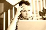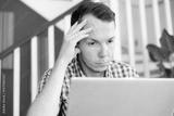 Focused Man Holding Pen Looking At Laptop Screen While Working Remotely At Home Office