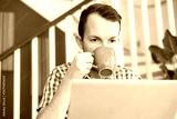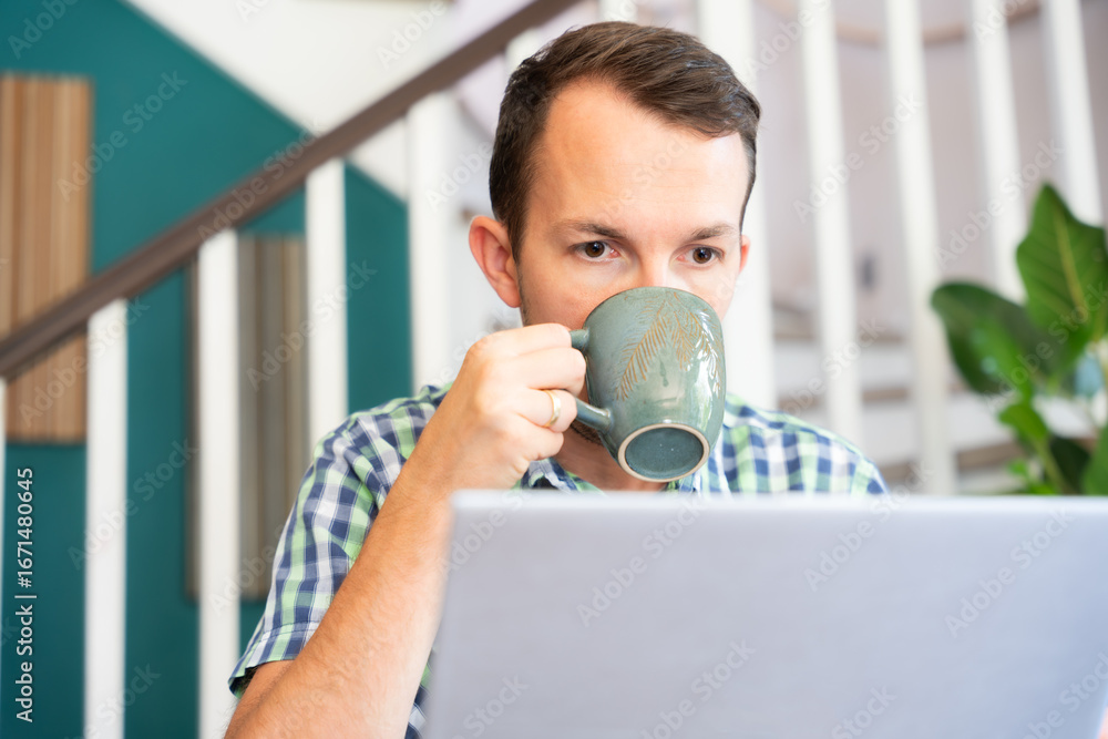 Man Drinking Coffee Mug While Working On Laptop At Home Office Remote Work