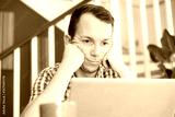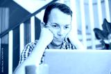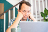 Smiling Man Resting Head On Hands Looking At Laptop Screen While Working From Home
